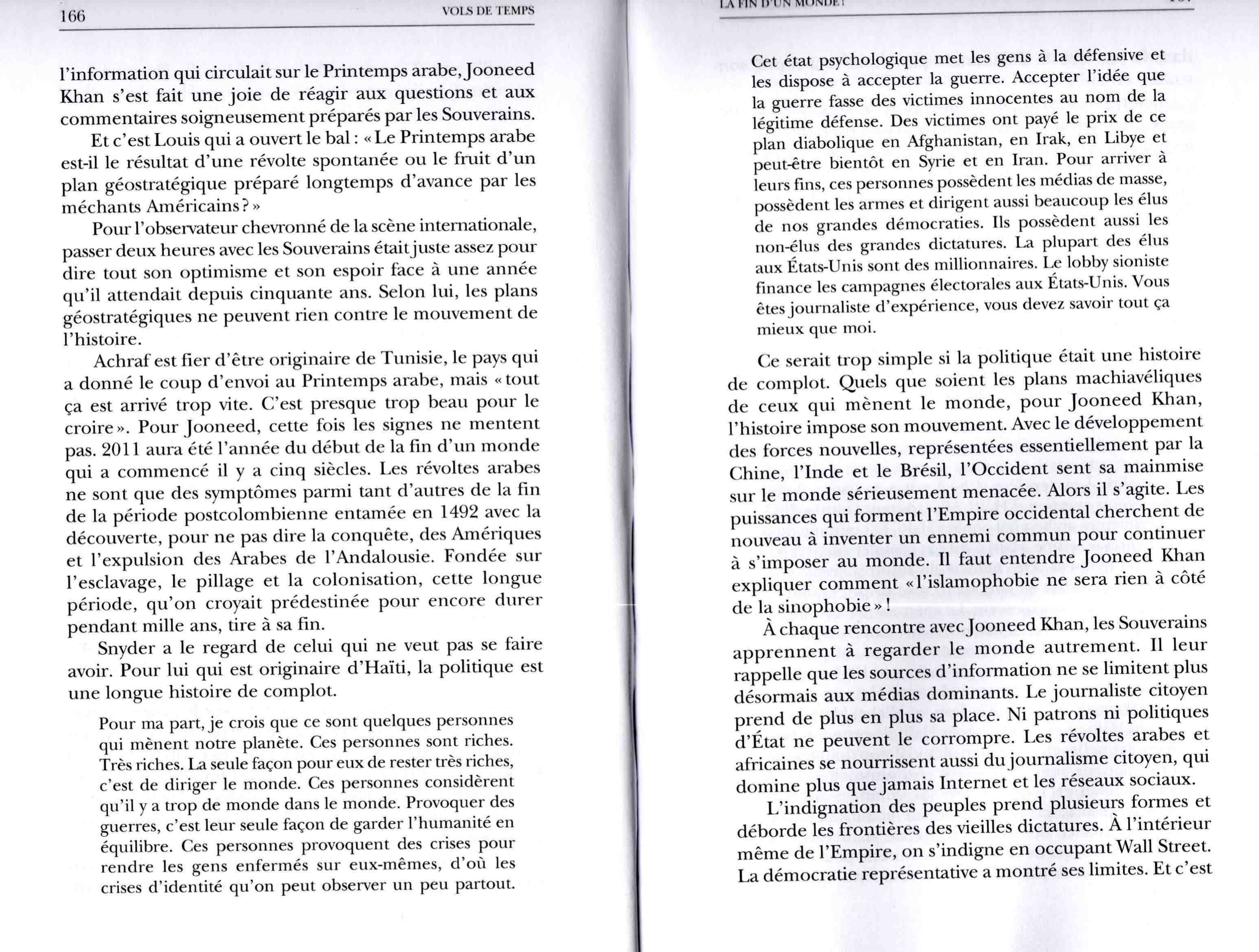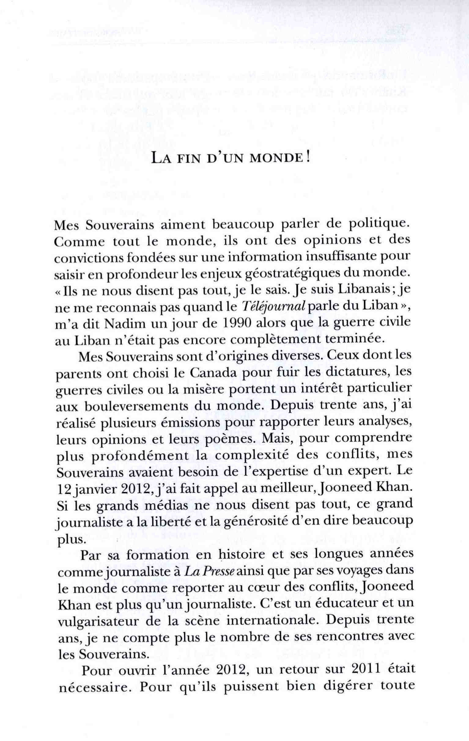 1- Bonjour Jooneed, je m’appelle Louis. Tout le plaisir est pour nous les Souverains de te recevoir pour la quatrième fois à notre émission. La dernière fois c’était il y a un an, jour pour jour, c’était la veille de la chute de Ben Ali en Tunisie. D’ailleurs, tu l’avais en quelque sorte prévue cette chute puisque tu as parlé du début de la fin des dictatures dans le monde arabe. Un an plus tard, nous aimerions faire avec toi le point sur cette année 2011 qui a connu des bouleversements majeurs dans le monde arabe. Des bouleversements qui n’ont pas fini d’affecter le monde entier. Alors commençons par la question la plus importante qui a dominé la préparation de cette rencontre. C’est une question qui divise les observateurs de la politique internationale, elle divise les opinions publiques. Une question à laquelle on aura peut-être aujourd’hui une réponse. Mais avant de te la poser, je rappelle à nos auditeurs que toi Jooneed Khan, tu as été pendant 35 ans, journaliste au Journal La Presse. Que tu as fais le tour du monde pour couvrir des évènements importants dont l’invasion de l’Irak. Que depuis 3 ans tu es à la retraite mais tu ne chômes pas. Tu as écris un livre intitulé ‘’Un autre Maurice est possible’’ sur ton pays natal. Que tu continues de donner des conférences et des entrevues comme aujourd’hui pour contribuer à expliquer le monde. Alors voici la question que tout le monde se pose. Écoute-la bien : Le printemps arabe est il le résultat d’une révolte spontanée ou c’est le fruit d’un plan géostratégique préparé longtemps d’avance par les méchants américains.. ? Autrement dit, le printemps arabe correspond t-il à de véritables révolutions ou plutôt à des soulèvements populaires récupérés et téléguidés par des intérêts occidentaux.. ?