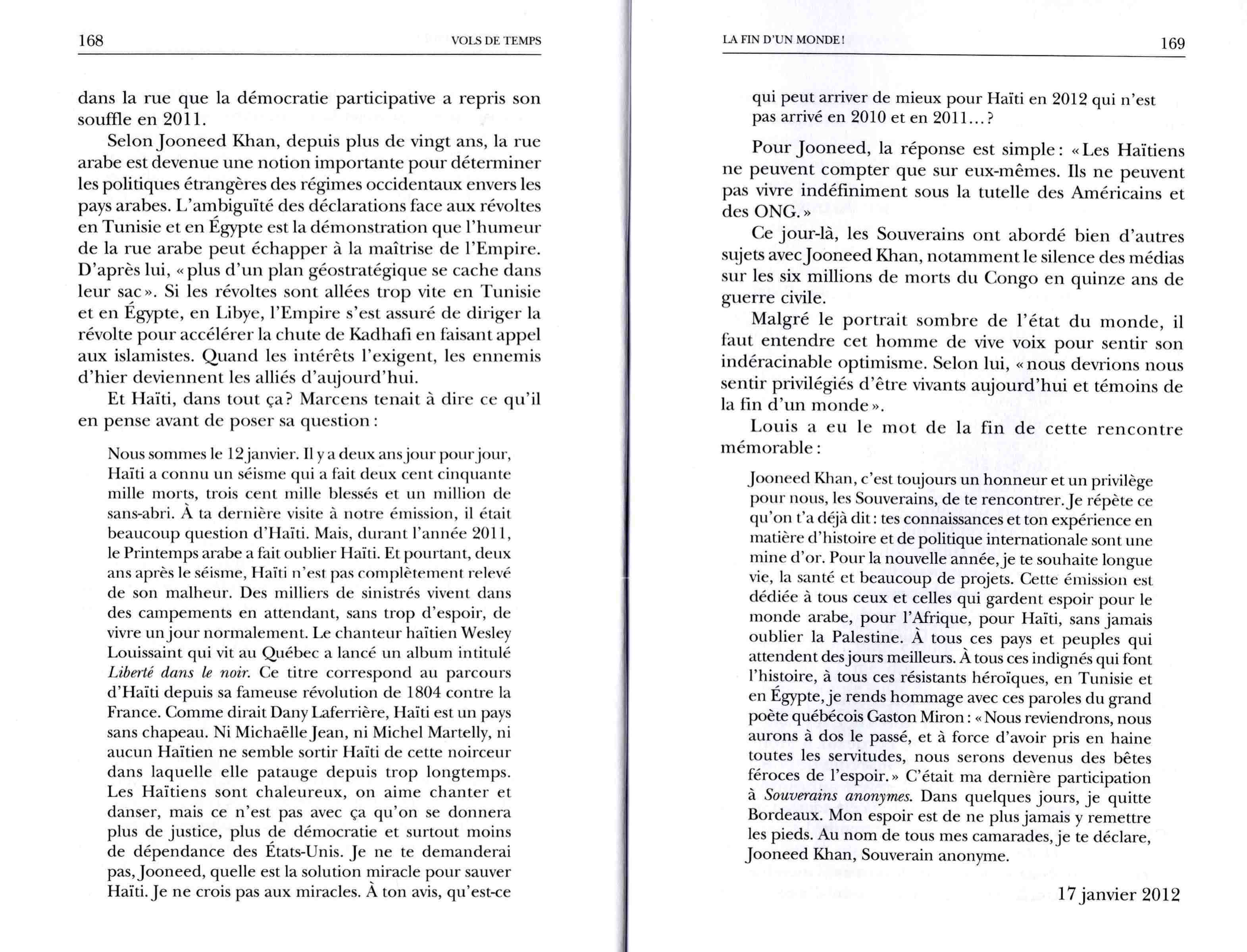 9- Jooneed Khan, C’est toujours un honneur et un privilège pour nous les Souverains de te rencontrer. Je répète ce qu’on t’a déjà dis : Tes connaissances et ton expérience en matière d’histoire et de politique internationale, sont une mine d’or. Pour la nouvelle année, je te souhaite longue vie, la santé et beaucoup de projets. Cette émission est dédiée à tous ceux et celles qui gardent espoir pour le monde arabe, pour l’Afrique, pour Haïti sans jamais oublier la Palestine. À tous ces pays et peuples qui attendent des jours meilleurs. À tous ces indignés qui font l’histoire, à tous ces hommes et femmes, en Tunisie et en Egypte, tombés sur le champ de la résistance, je rends hommage avec ces paroles du grand poète québécois Gaston Miron : « Nous reviendrons, nous aurons à dos le passé, et à force d'avoir pris en haine toutes les servitudes, nous serons devenus des bêtes féroces de l'espoir. » C’était ma dernière participation à Souverains anonymes. Dans quelques jours je quitte Bordeaux. Mon espoir est de ne plus jamais y remettre les pieds. Au nom de tous mes camarades, je te déclare Jooneed Khan, pour la quatrième fois, Souverain anonyme.