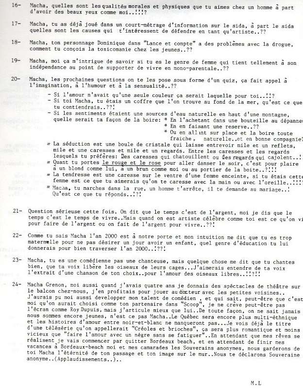 29 questions ont été posées par les Souverains à l'actrice Macha Grenon le 23 avril 1992.