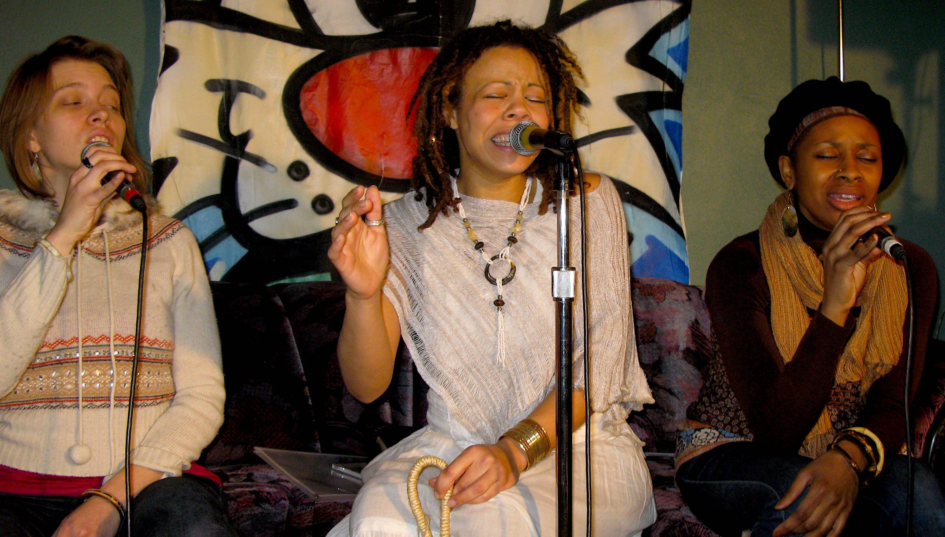1- Bonjour Sara, Sylphir et Marilyn je m’appelle Rollo. Moi et mes amis Souverains nous sommes très heureux et honorés de vous recevoir pour la deuxième fois à notre émission. Je n’étais pas là à votre premier passage il y’a quelques mois, mais j’ai vu et entendu quelques extraits de cette rencontre et je suis encore impressionné par vos talents d’artistes, impressionné aussi par cet esprit de prière, d’espoir et de transe qui animent votre façon de chanter. C’est pourquoi nous avons choisi de donner comme thème à notre rencontre d’aujourd’hui, la spiritualité. Pour beaucoup parmi nous, durant notre expérience carcérale, la spiritualité devient une bouée extraordinaire pour nous faire supporter la prison. Y’en a qui se rappellent de Dieux uniquement à leur arrivée derrière les murs, pour d’autres Dieux est partout mais y’en a aussi qui se sentent abandonnés par Dieu et finissent par croire que Dieu est nulle part. Dans notre rencontre, on voudrait vous présenter différents témoignages sur le parcours spirituel de plusieurs parmi nous et vous êtes libre de réagir à nos témoignages et nos questions en paroles ou en chansons.. Mais avant de procéder j’aimerais poser ma première question à Sylphir et Marilyn. Vous avez été choisi par Sara pour l’accompagner vocalement dans ses spectacles et dans ses albums. Vous savez à quel point Sara est une femme très spirituelle, sa voix est empreinte de mystère et de mystique. Êtes-vous devenues aussi habitées qu’elle par le mystère et la mystique des voix créoles..???